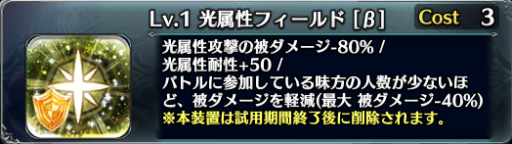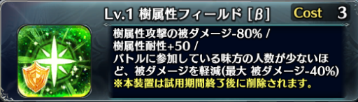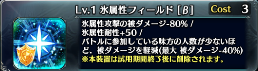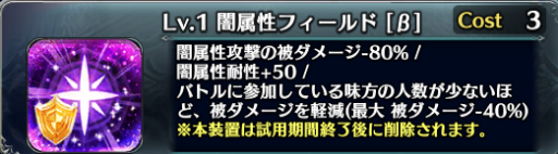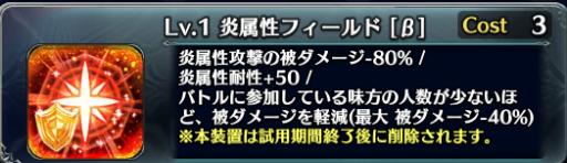 属性フィールドは耐久に特化した装置で、その属性のダメージを80%軽減、そしてその属性の耐性を+50、さらに参加人数に応じて全ての被ダメージを軽減します。