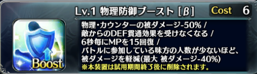 こちらは対策できる範囲が広い代わりに被ダメージ軽減は50%、そしてコストが6必要です。なので、物理防御ブースト、または魔法防御ブーストを採用する際はどこかのBattleは防衛装置が使えなくなります。